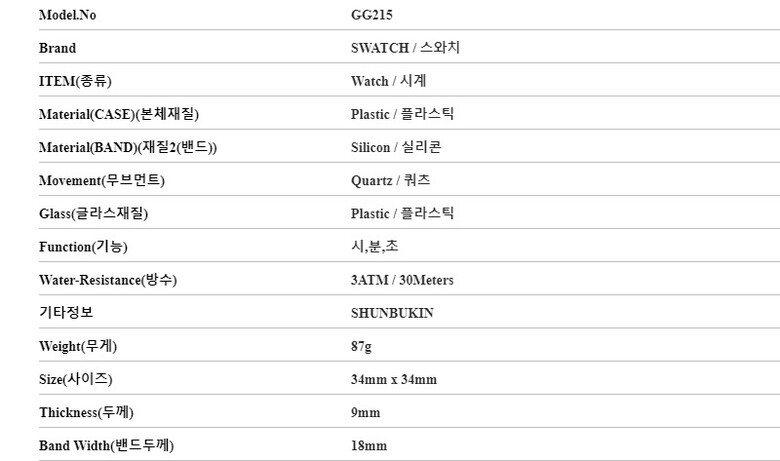 | 7. 주요 사양 | 플라스틱 시계 쿼츠 |