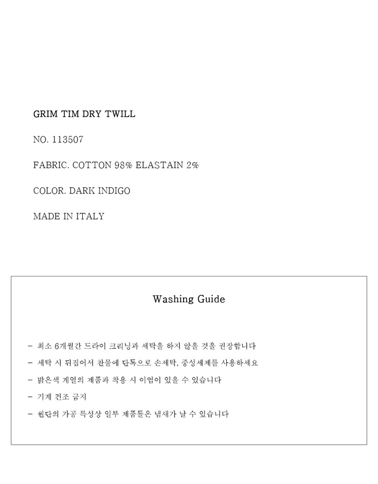 | 6. 세탁방법 및 취급시 주의사항 | 데님 및 컬러 원단 제품 등을 세탁 시에 이염 될 우려가 있으므로 찬물 단독 세탁을 권장합니다. 제품의 세탁 표기를 확인 후 세탁하세요. |