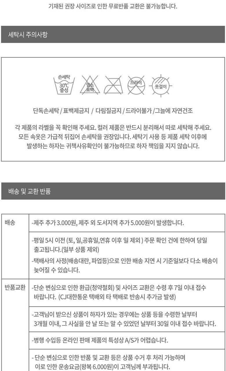• 처음 배송된 상품상태와 다를 경우(세탁/착용 후 외출하신 경우) 반품이 불가합니다.