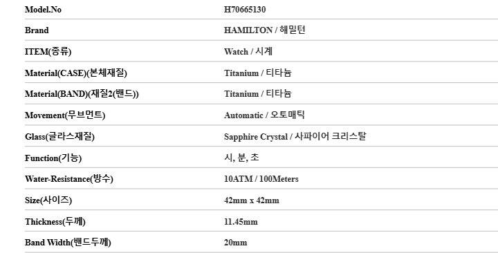 | 7. 주요 사양 | 티타늄 시계 오토매틱 |