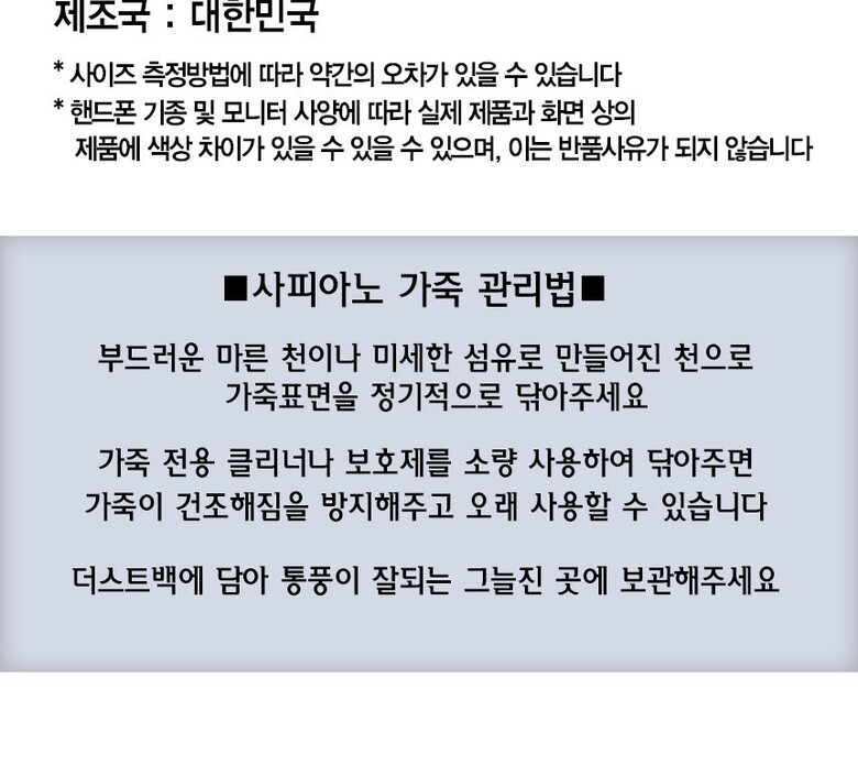 6. 취급시 주의사항 | 가죽 전용 클리너나 보호제를 소량 사용하여 닦아주면 가죽이 건조해짐을 방지해주고 오래 사용할 수 있습니다 |