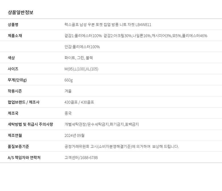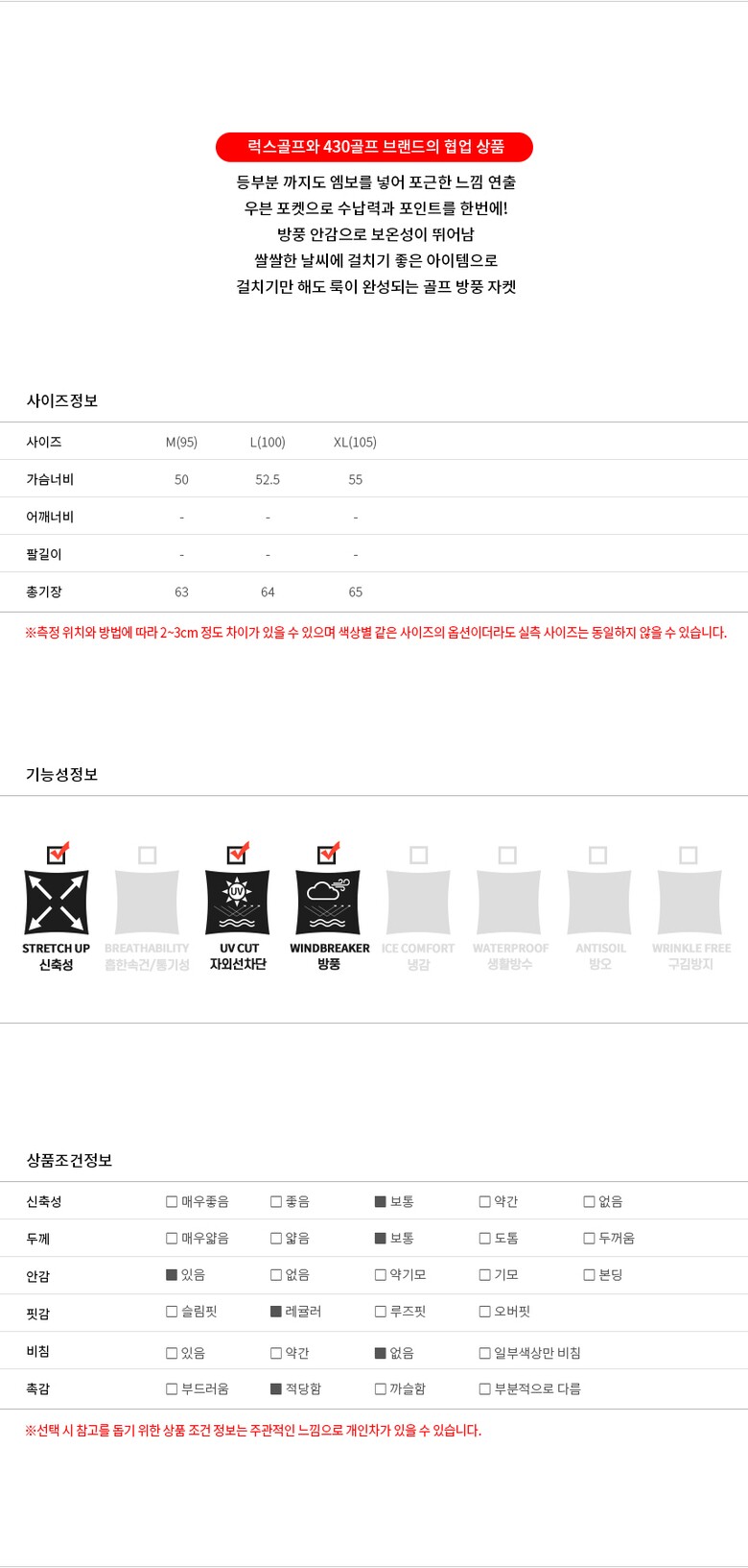 | 1. 제품 소재 (섬유의 조성 또는 혼용률을 백분율로 표시, 기능성인 경우 성적서 또는 허가서) | 상세설명참고 |