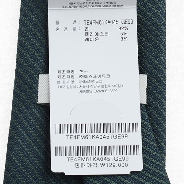 | 6. 취급시 주의사항 | -넥타이 보관시 매듭을 풀고 보관해 주십시요.-구김이 가지 않도록 길게 걸어두시는것이 좋습니다.-니트 타이의 경우, 장기간 걸어두시면 늘어날 수 있습니다. -둥글게 말아서 보관해 주십시요. - 접어서 보관하실 경우, 모양이 망가질 수 있으니 피해 주십시요.-물세탁시 제품의 광택 및 색상이 감소될 우려가 있습니다. -세탁시 사용시 모양이 망가질 수 있습니다. |