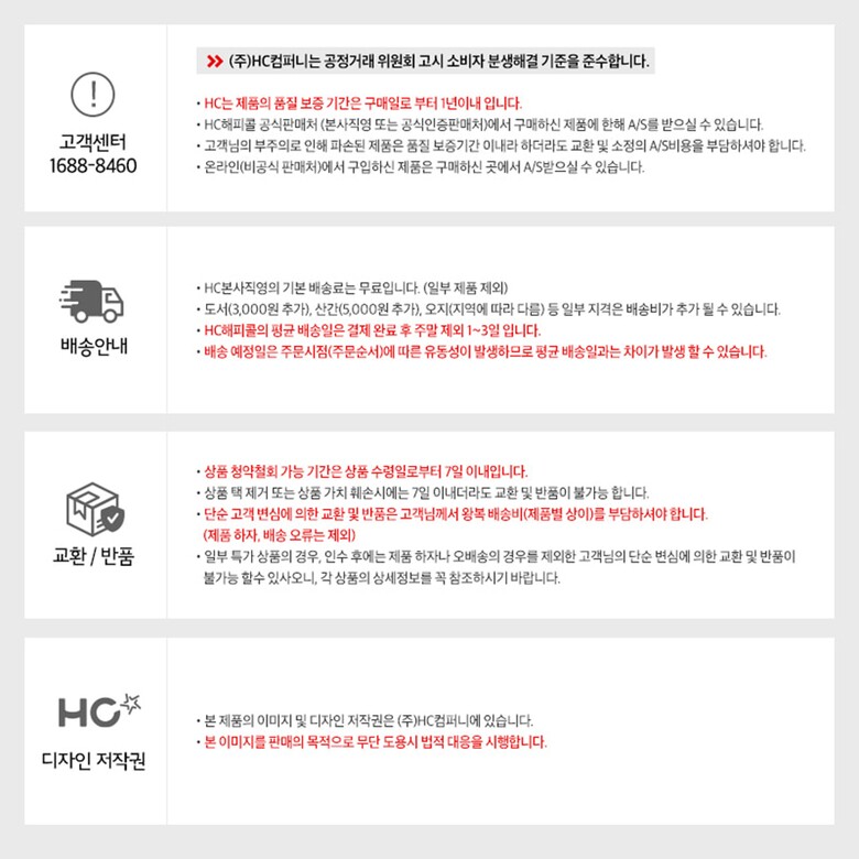 • 모든 규정은 전자상거래법에 의거하며, 택배사정으로 배송이 지연된 경우 재화를 공급받은 날로부터 7일 이내에 반품 가능합니다.