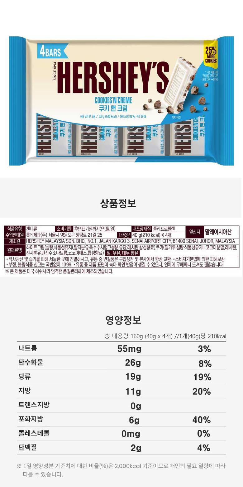 [롯데_1+1 행사] 허쉬 레귤러바 쿠앤크 160g