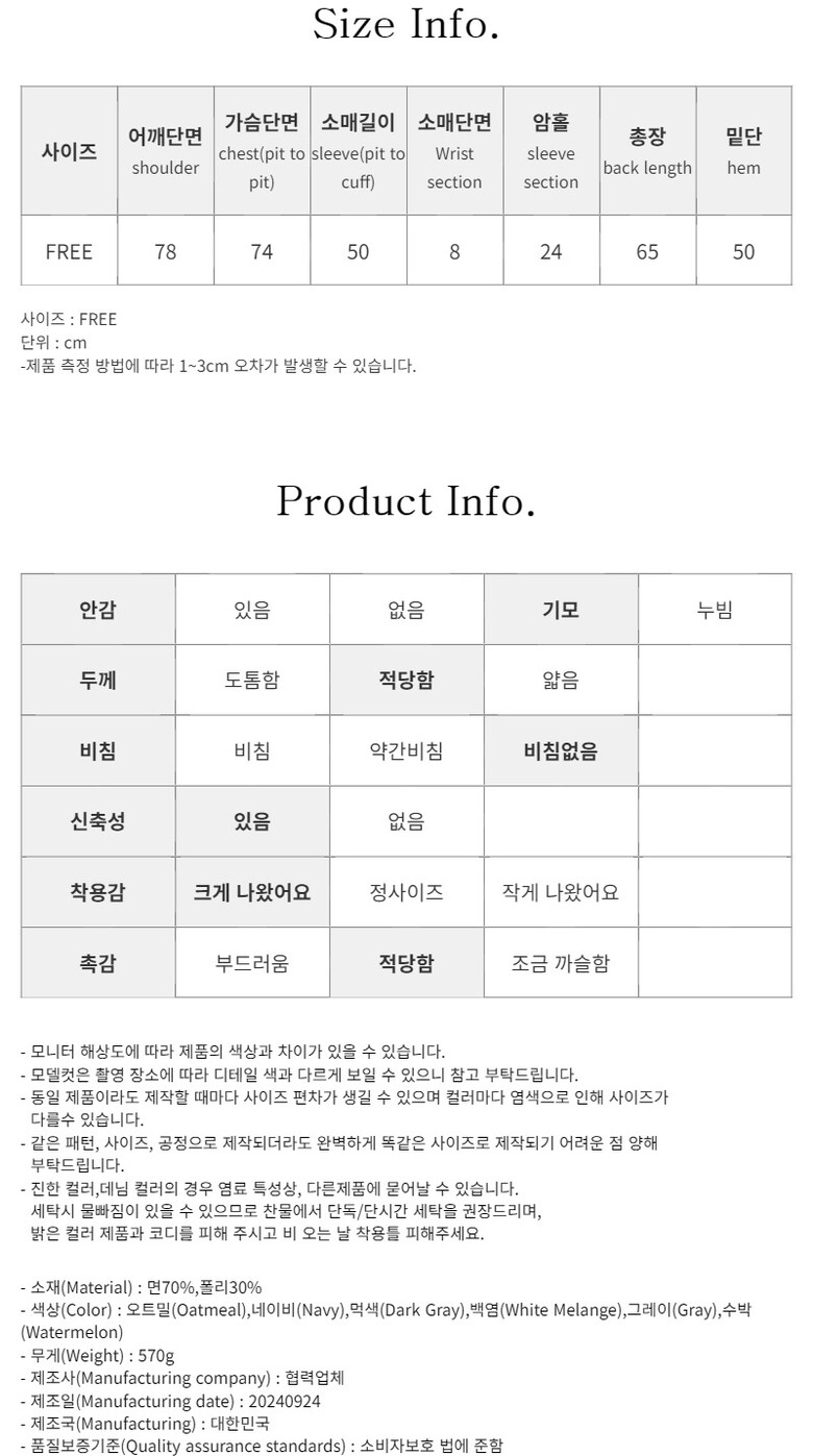 | 1. 제품 소재 (섬유의 조성 또는 혼용률을 백분율로 표시, 기능성인 경우 성적서 또는 허가서) | 상세이미지 참조 |