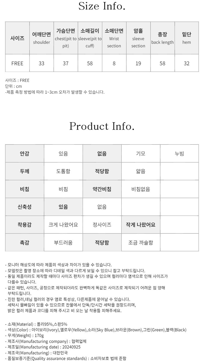 | 1. 제품 소재 (섬유의 조성 또는 혼용률을 백분율로 표시, 기능성인 경우 성적서 또는 허가서) | 상세이미지 참조 |