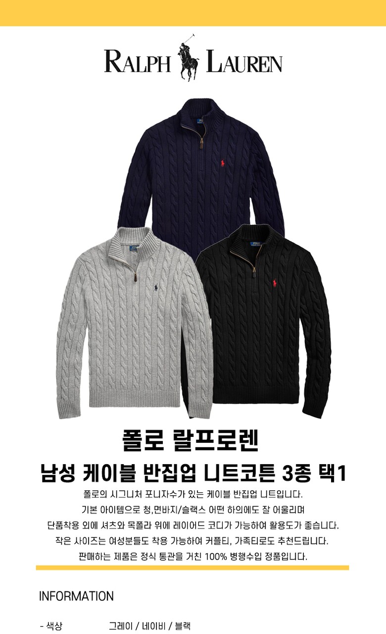 POLO 폴로 랄프로렌 남성 케이블 반집업 니트코튼 3종 택1
