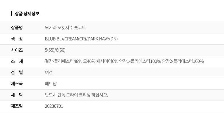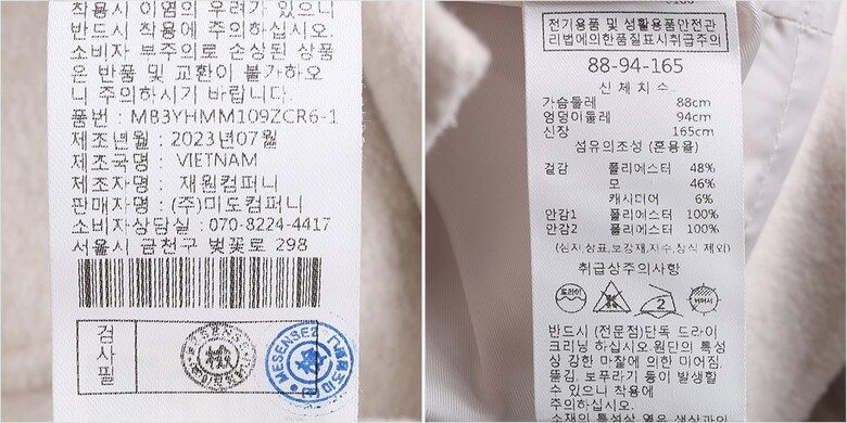 | 1. 제품 소재 (섬유의 조성 또는 혼용률을 백분율로 표시, 기능성인 경우 성적서 또는 허가서) | 겉감-폴리에스터48% 모46% 캐시미어6% 안감1-폴리에스터100% 안감2-폴리에스터100% |