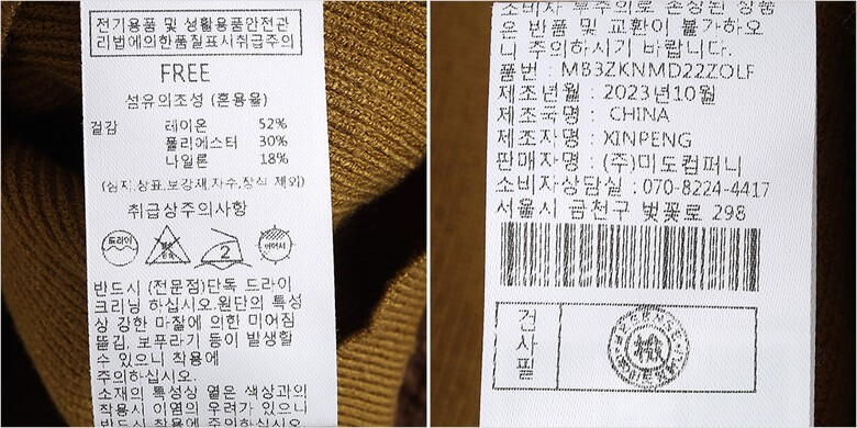 | 1. 제품 소재 (섬유의 조성 또는 혼용률을 백분율로 표시, 기능성인 경우 성적서 또는 허가서) | 겉감-폴리에스터30% 나일론18% 레이온52% |