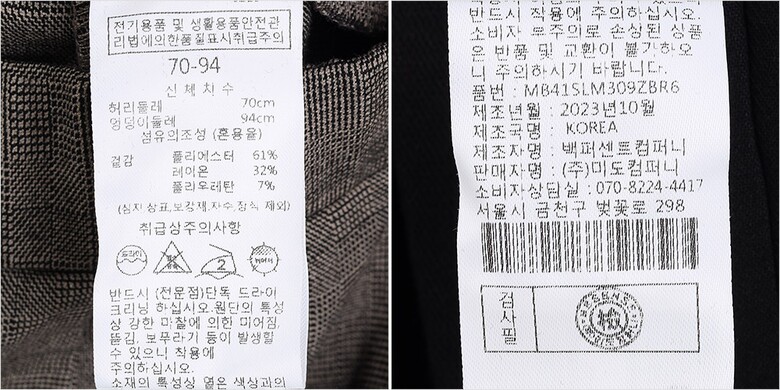 1. 제품 소재 (섬유의 조성 또는 혼용률을 백분율로 표시, 기능성인 경우 성적서 또는 허가서) 겉감-폴리에스터61% 폴리우레탄7% 레이온32%