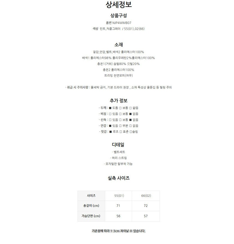 하프기장 벨티드 구스다운 패딩 점퍼 NJP4WMB07