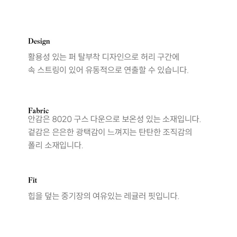 | 1. 제품 소재 (섬유의 조성 또는 혼용률을 백분율로 표시, 기능성인 경우 성적서 또는 허가서) | 상품상세참조 |