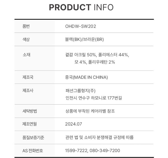 1. 제품 소재 (섬유의 조성 또는 혼용률을 백분율로 표시, 기능성인 경우 성적서 또는 허가서) | 상품상세참조 |