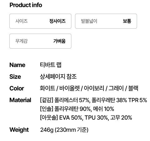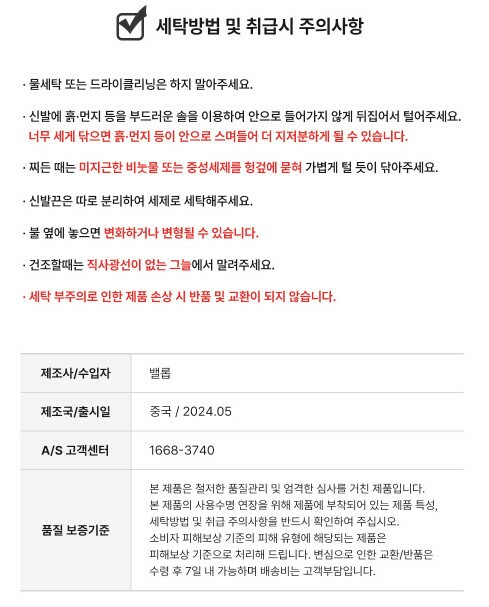 | 1. 제품 소재 (운동화인 경우에는 겉감, 안감을 구분하여 표시) | 상품상세참조 |