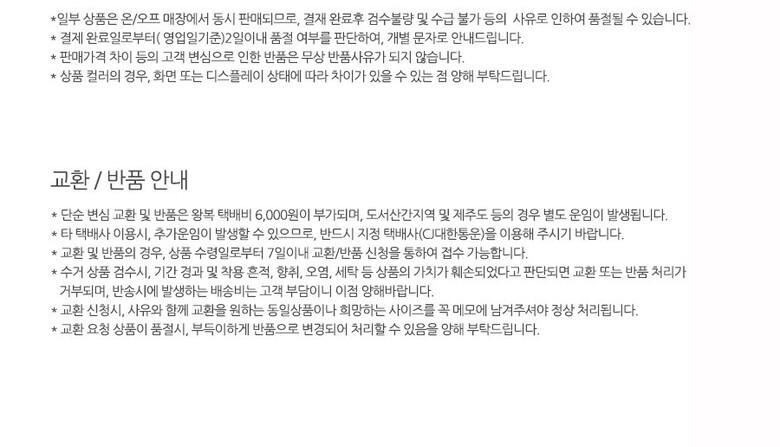 상품불량에 의한 반품, A/S, 품질보증 및 피해보상 등에 관한 사항은 소비자 분쟁해결기준(공정거래위원회 고시) 구매자가 미성년자인 경우에는 상품 구입시 법정대리인이 동의하지 아니하면 미성년자 본인 또는 법정대리인이 구매취소 할 수 있습니다. |