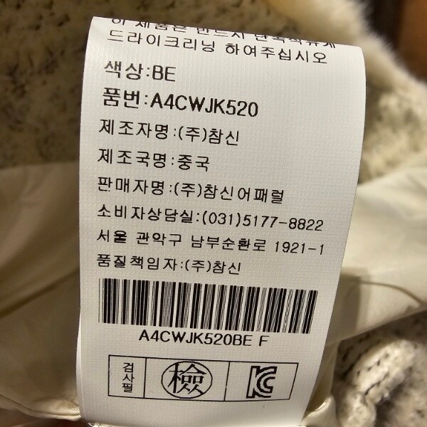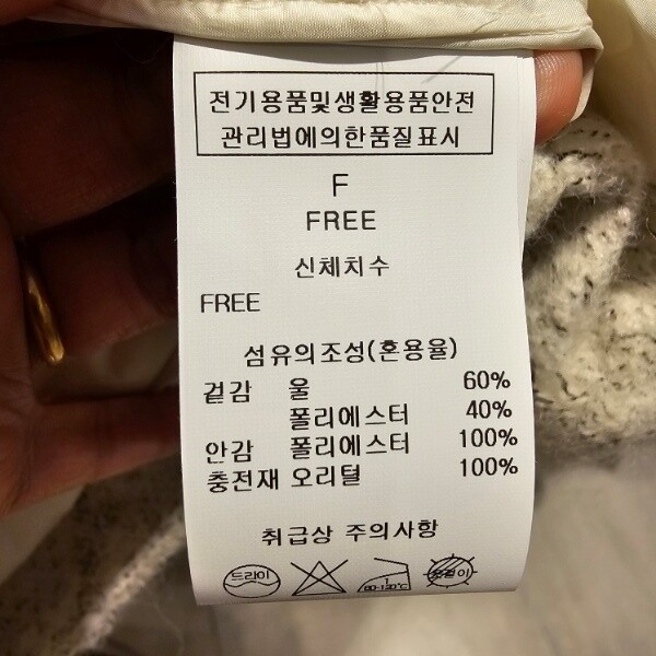 | 1. 제품 소재 (섬유의 조성 또는 혼용률을 백분율로 표시, 기능성인 경우 성적서 또는 허가서) | 겉감 울 50% 폴리에스터 40% / 안감 폴리에스터 100% / 충전재 오리털 100% |