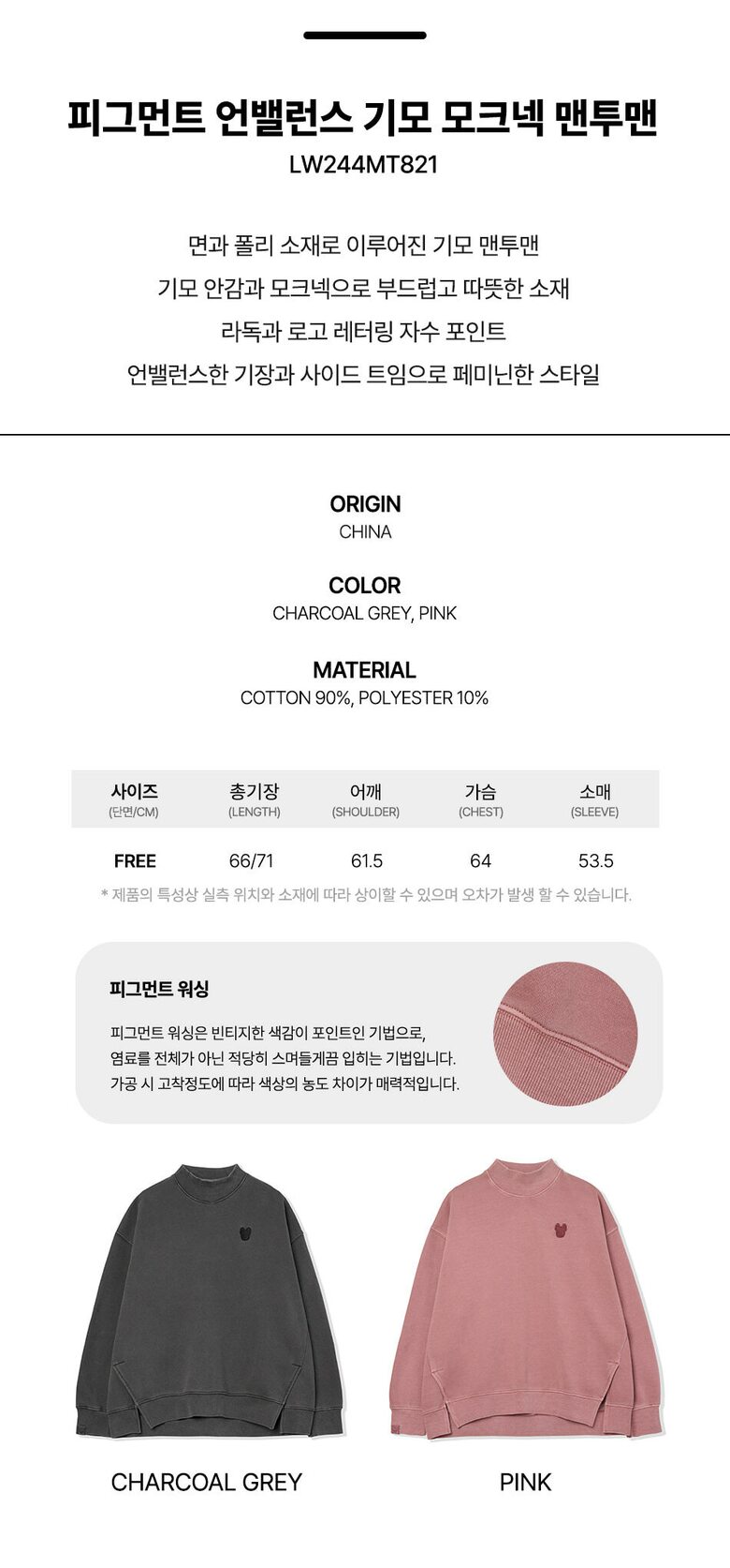여성) 피그먼트 언밸런스 기모 모크넥 맨투맨