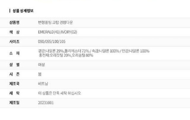 1. 제품 소재 (섬유의 조성 또는 혼용률을 백분율로 표시, 기능성인 경우 성적서 또는 허가서) 상품상세참조