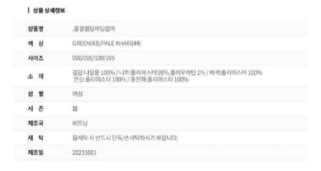 | 1. 제품 소재 (섬유의 조성 또는 혼용률을 백분율로 표시, 기능성인 경우 성적서 또는 허가서) | 상품상세참조 |