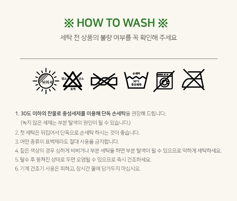 | 6. 세탁방법 및 취급시 주의사항 | 첫 단독 손세탁 권장, 단독세탁, 손세탁, 중성세제, 찬물세탁 |