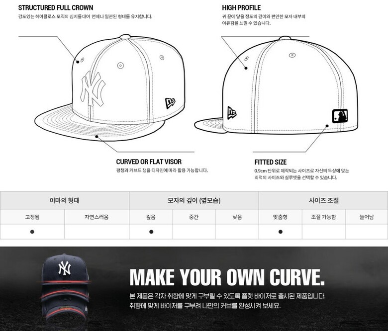 59FIFTY란 MLB 선수용 모자로 개발된 New Era의 시그니처 모델이자 최초의 Fitted Cap입니다. 사용자의 두상 크기에 따라 각 0.9cm의 편차를 두고 성인 9개, 유아용 8개 총 17개의 사이즈로 구성되어 착용 시 최고의 Fitting감을 줄 수 있도록 고안되었습니다. 각 Size는 59FIFTY를 상징하는 Gold Visor Sticker에 표기되어 모자 챙 상단에 부착되어 있으며, 모자의 챙은 기본적으로 Flat visor로 제작됩니다. 이는 제품의 이동 시 파손을 방지함과 동시에 개인의 취향에 따라 다양한 각도로 구부려 착용할 수 있도록 하기 위함이며, 선수의 경기력 향상과 부상 방지를 위하여 가벼운 펄프 소재의 심지로 구성되어 있습니다.