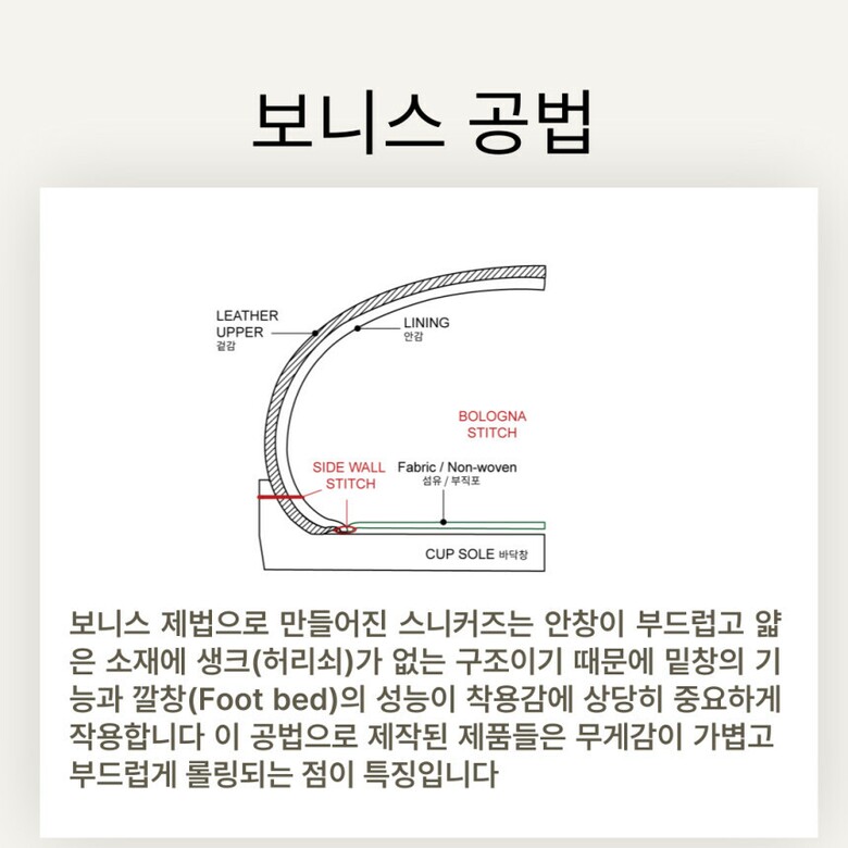 보니스 공법으로 제작이 되어 신발 자체에 롤링감이 좋아 편안한 착화감을 주고