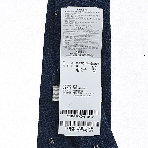 | 6. 취급시 주의사항 | -넥타이 보관시 매듭을 풀고 보관해 주십시요.-구김이 가지 않도록 길게 걸어두시는것이 좋습니다.-니트 타이의 경우, 장기간 걸어두시면 늘어날 수 있습니다. -둥글게 말아서 보관해 주십시요. - 접어서 보관하실 경우, 모양이 망가질 수 있으니 피해 주십시요.-물세탁시 제품의 광택 및 색상이 감소될 우려가 있습니다. -세탁시 사용시 모양이 망가질 수 있습니다. |