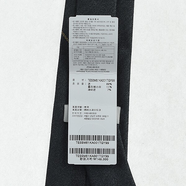 | 6. 취급시 주의사항 | -넥타이 보관시 매듭을 풀고 보관해 주십시요.-구김이 가지 않도록 길게 걸어두시는것이 좋습니다.-니트 타이의 경우, 장기간 걸어두시면 늘어날 수 있습니다. -둥글게 말아서 보관해 주십시요. - 접어서 보관하실 경우, 모양이 망가질 수 있으니 피해 주십시요.-물세탁시 제품의 광택 및 색상이 감소될 우려가 있습니다. -세탁시 사용시 모양이 망가질 수 있습니다. |