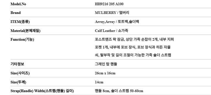멀버리 HH9216 205 A100 베이스워터 그레인 탑 핸들 토트백 가방