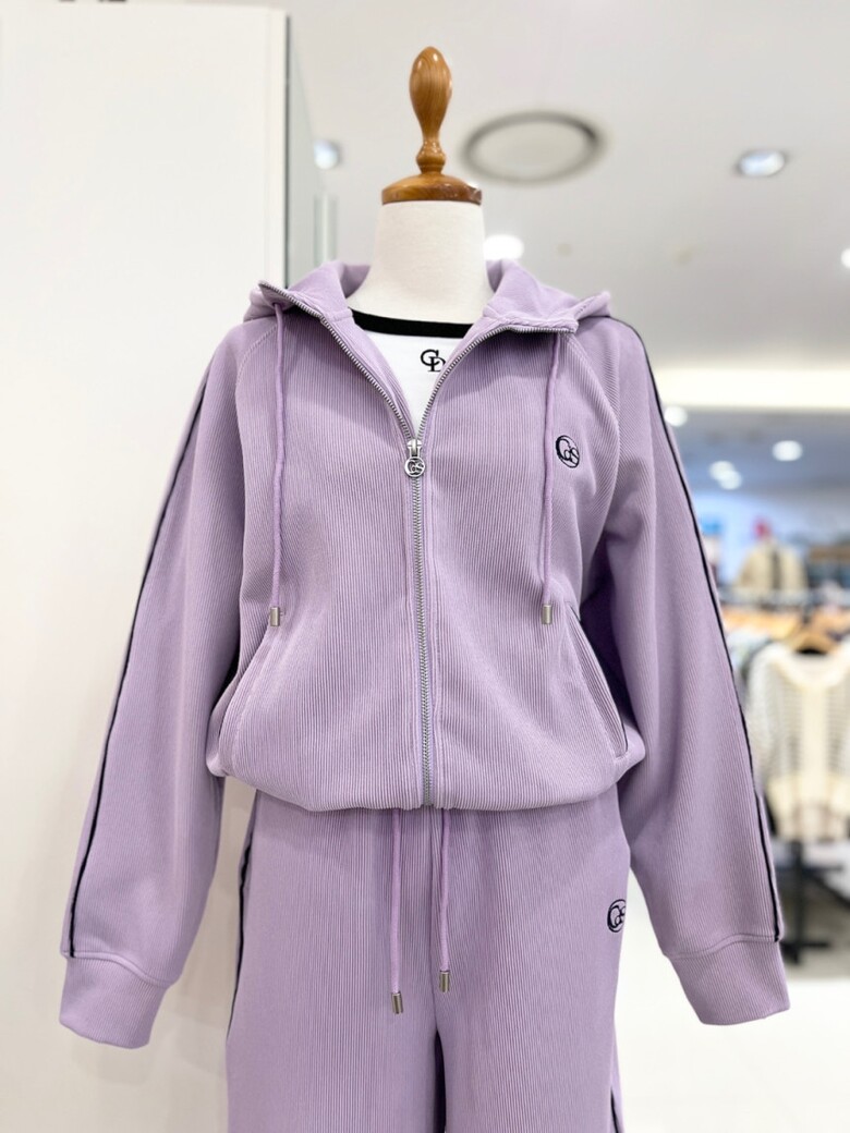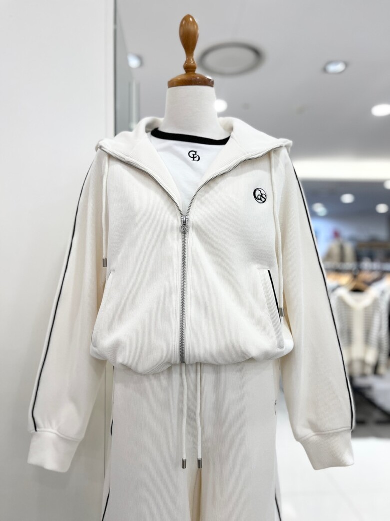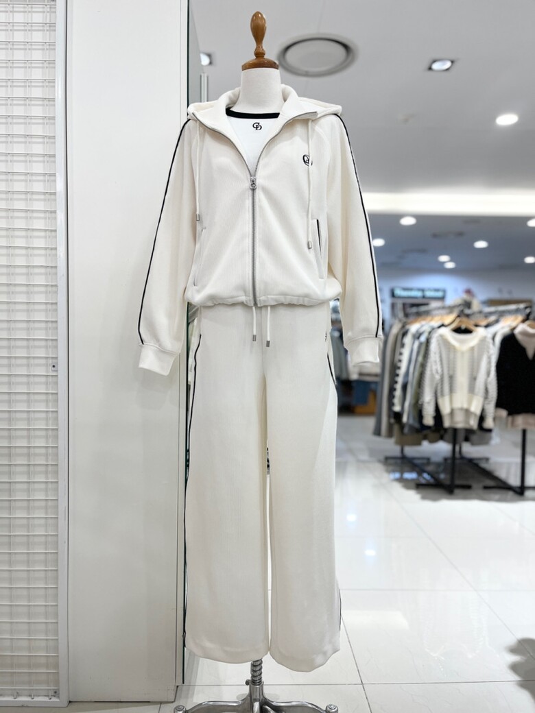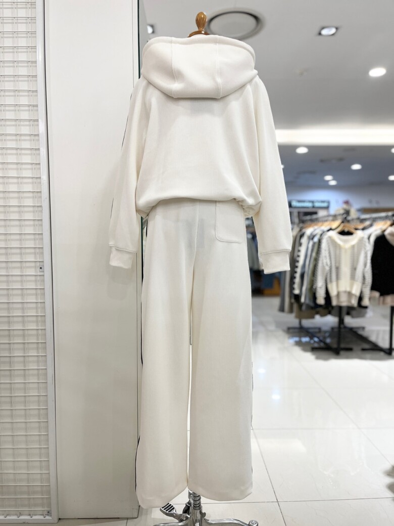 리브드 소재의 배색라인이 돋보이는 후드집업+트랙팬츠 셋업입니다