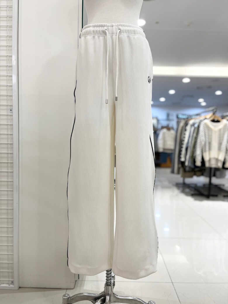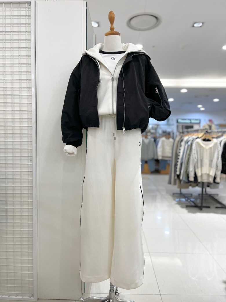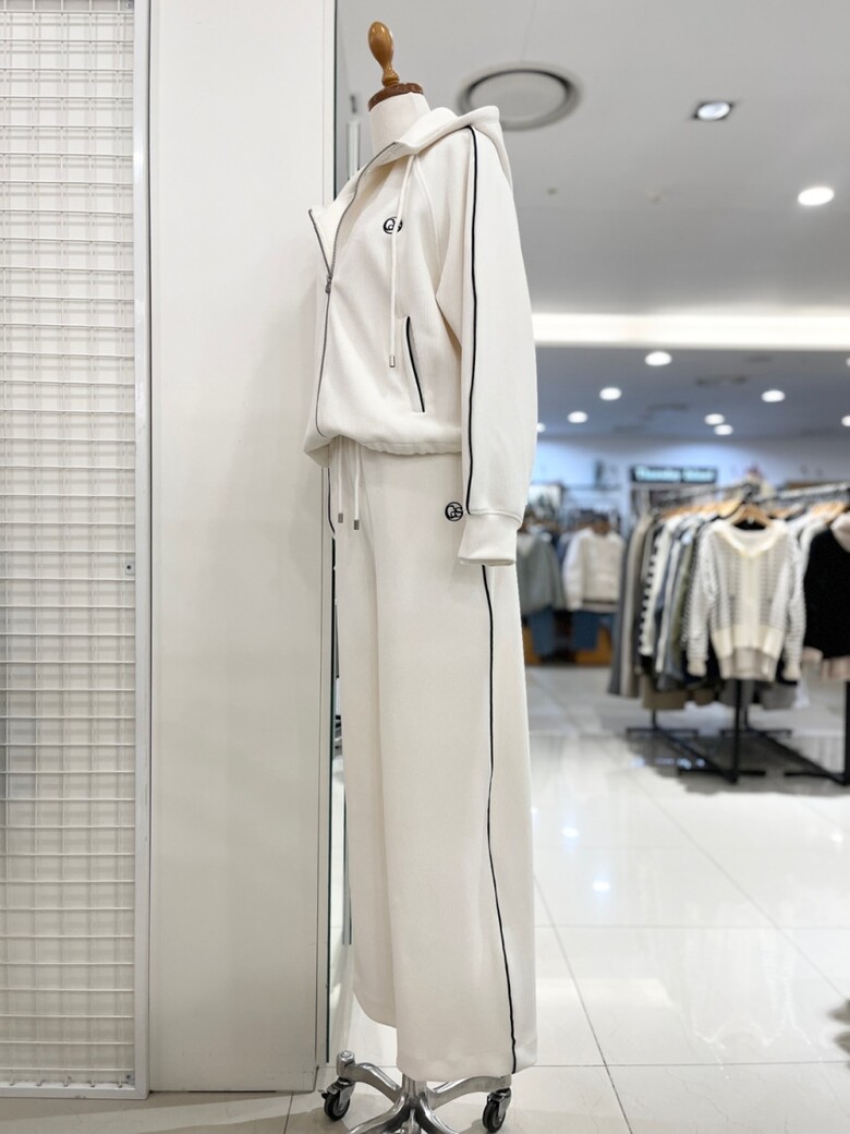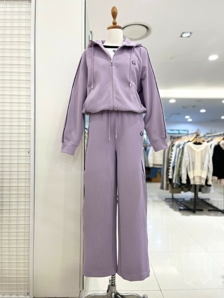 리브드 소재의 배색라인이 돋보이는 후드집업+트랙팬츠 셋업입니다