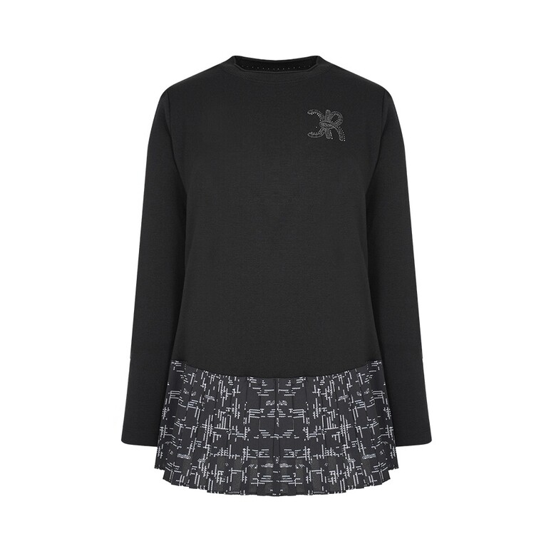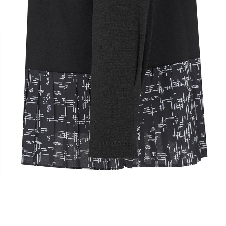 밑단 단도 프린트와 플리츠가 있어 고급스럽게 연출 가능한 아이템입니다.네크라인이 시보리 말림단이 있어 입고 벗는데 용이한 아이템입니다
