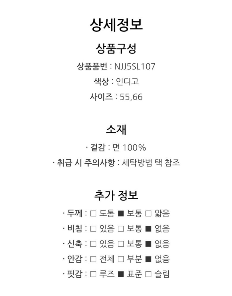 | 1. 제품 소재 (섬유의 조성 또는 혼용률을 백분율로 표시, 기능성인 경우 성적서 또는 허가서) | 상품상세참조 |