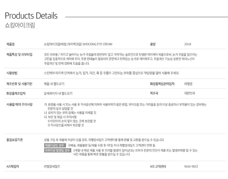 라벨영 쇼킹아이크림 20ml 눈밑+눈가주름 탄력케어 주름개선 기능성 아이세럼 기초 화장품