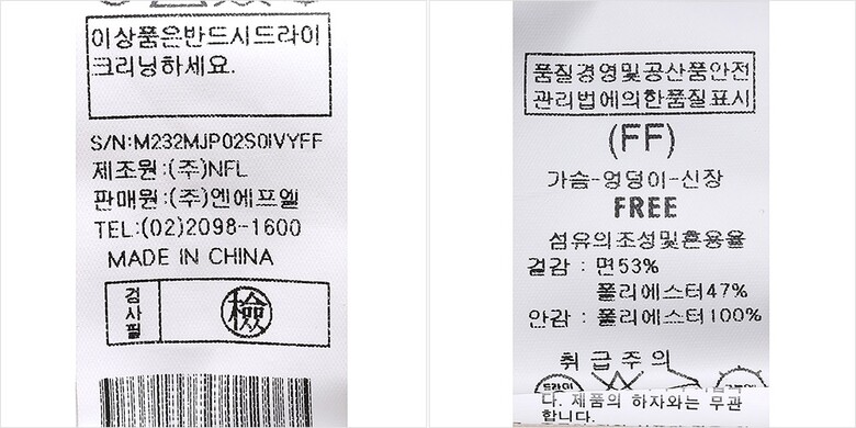 | 1. 제품 소재 (섬유의 조성 또는 혼용률을 백분율로 표시, 기능성인 경우 성적서 또는 허가서) | 겉감-면53% 폴리에스터47% 안감-폴리에스터100% |