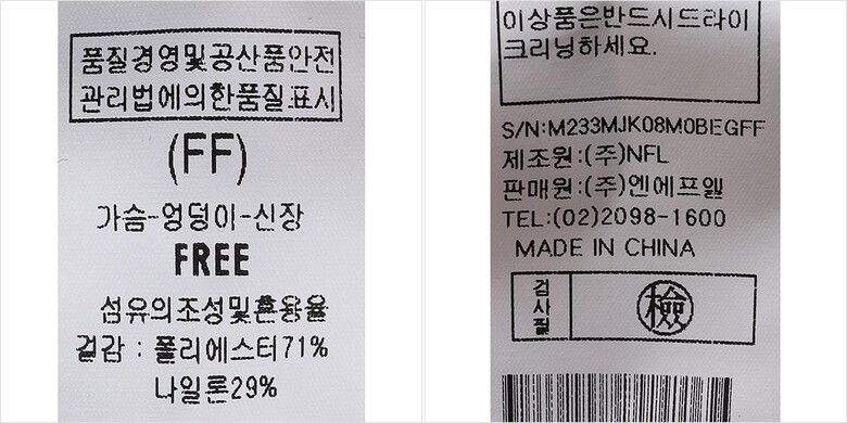 | 1. 제품 소재 (섬유의 조성 또는 혼용률을 백분율로 표시, 기능성인 경우 성적서 또는 허가서) | 겉감-폴리에스터71% 나일론29% |