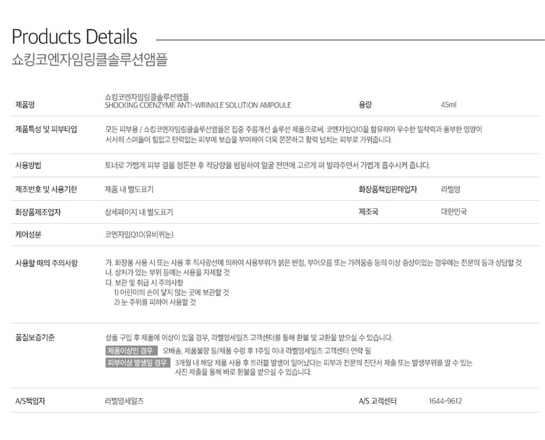 라벨영 쇼킹코엔자임링클솔루션앰플 50ml 주름, 탄력, 보습케어 주름탄력에센스 피부결케어