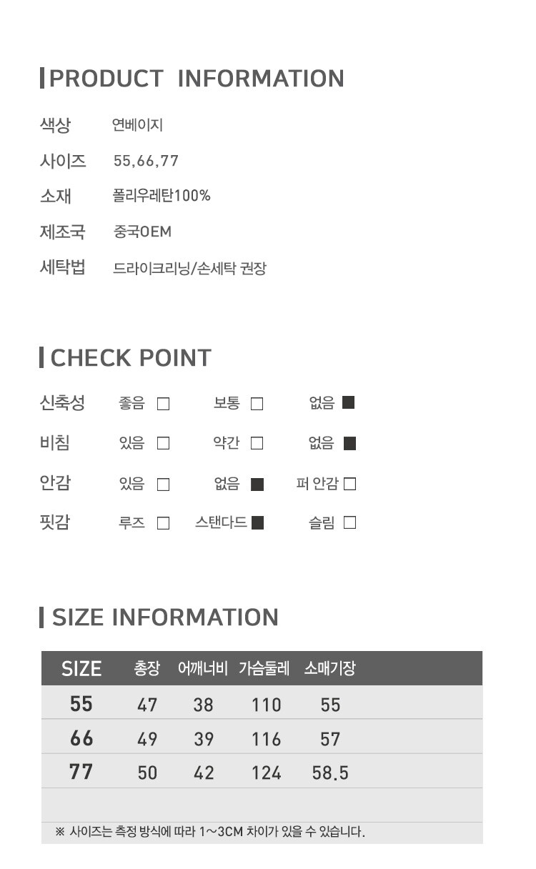 | 1. 제품 소재 (섬유의 조성 또는 혼용률을 백분율로 표시, 기능성인 경우 성적서 또는 허가서) | 상세페이지참고 |