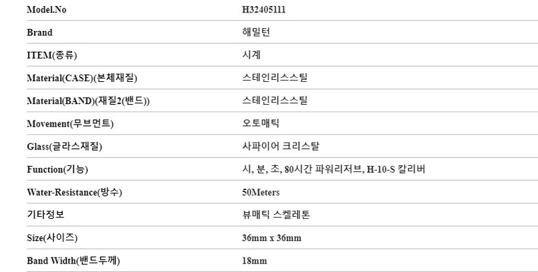 | 7. 주요 사양 | 스테인리스스틸 시계 오토매틱 |