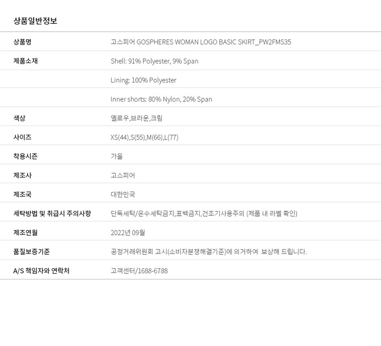 | 1. 제품 소재 (섬유의 조성 또는 혼용률을 백분율로 표시, 기능성인 경우 성적서 또는 허가서) | Shell: 91% Polyester, 9% Span / Lining: 100% Polyester / Inner shorts: 80% Nylon, 20% Span |