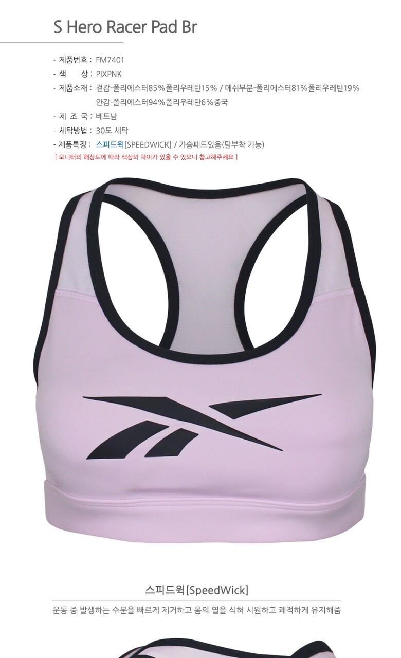 리복 여성 클래식 S 히어로 레이서 패디드 스피드윅 스포츠브라 브라탑 매장판-FM7401