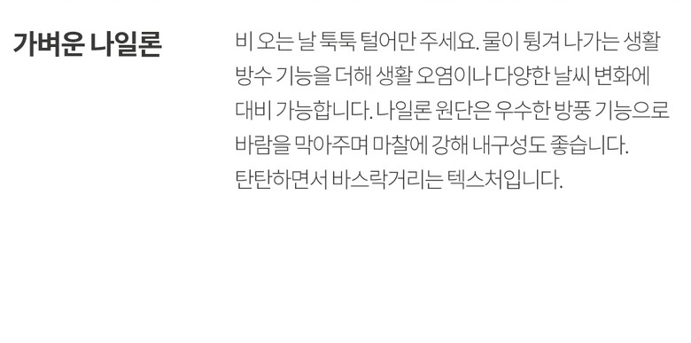 | 1. 제품 소재 (섬유의 조성 또는 혼용률을 백분율로 표시, 기능성인 경우 성적서 또는 허가서) | 나일론 100% |