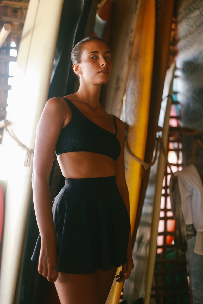 UPF50+의 UV 차단 기능이 있는 스트레치 원단을 사용하여 신축성 좋게 플레어 라인이 떨어지며,