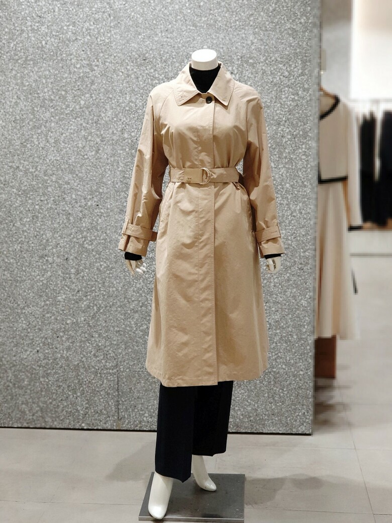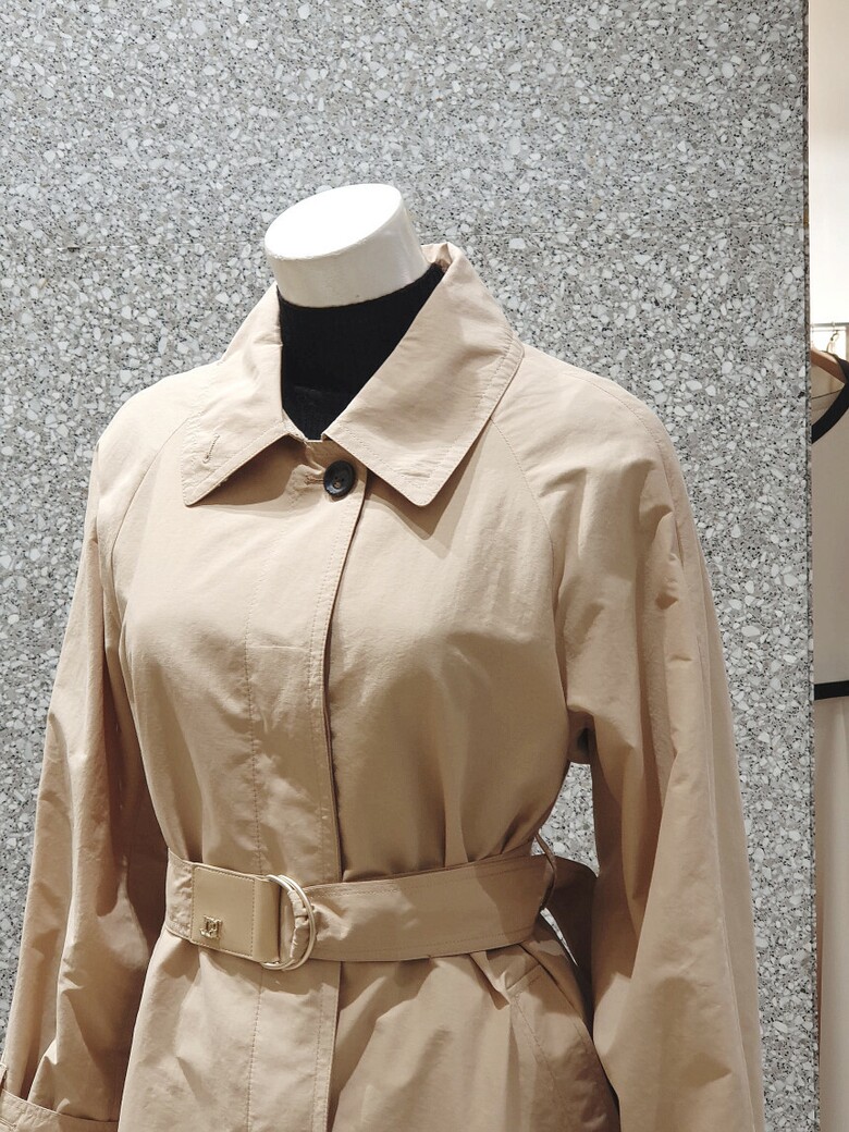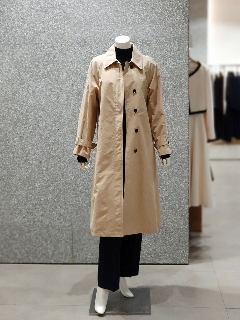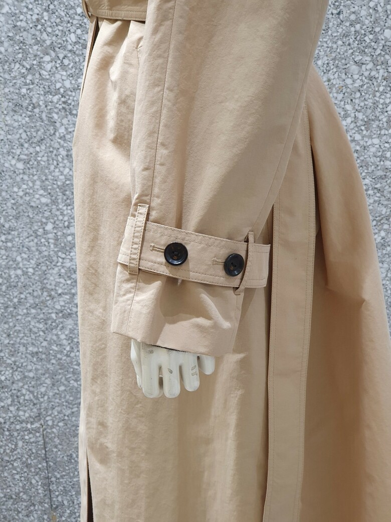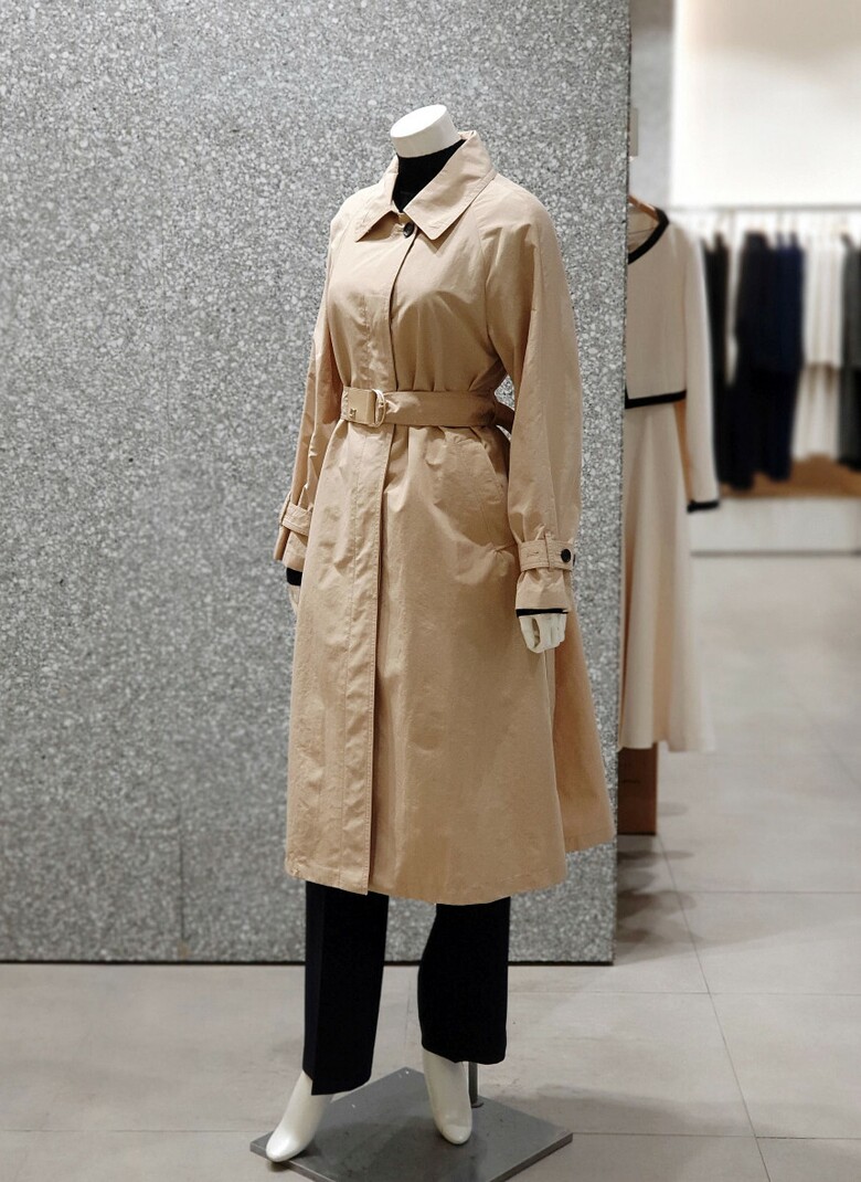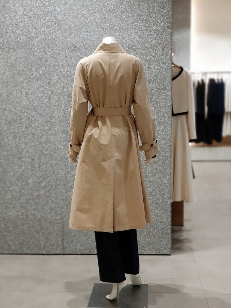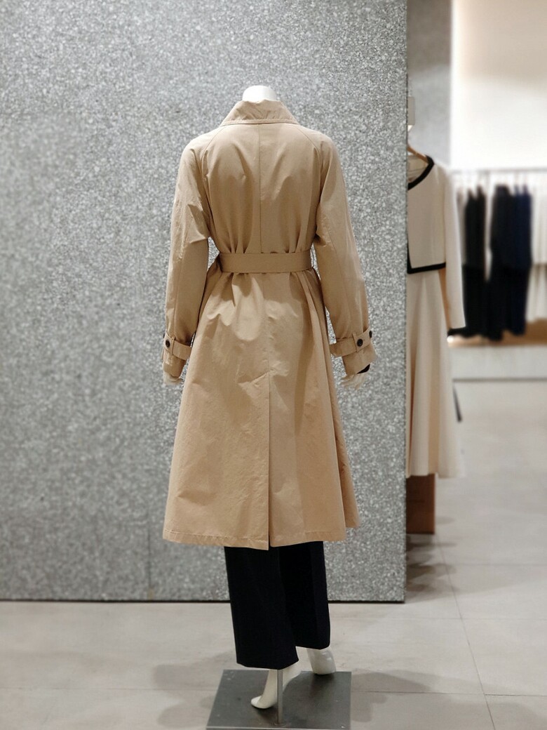 래글런 슬리브 디자인의 트렌치 코트입니다.
