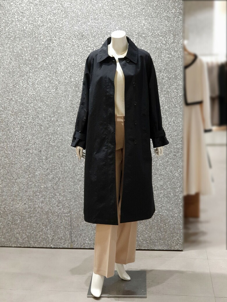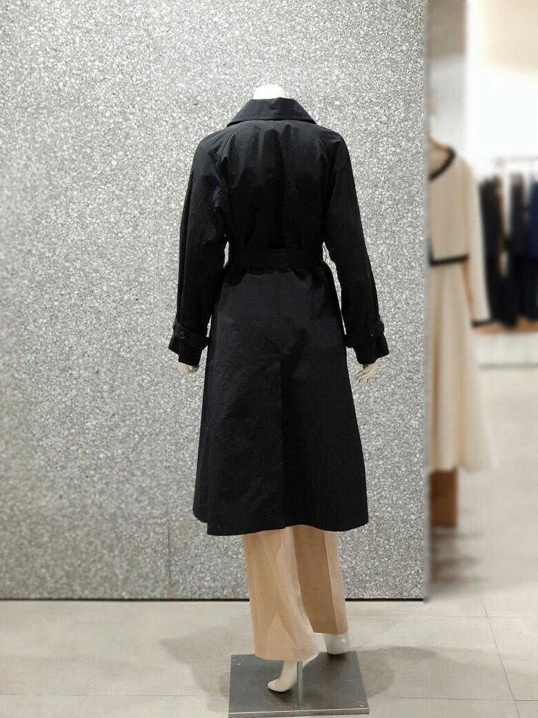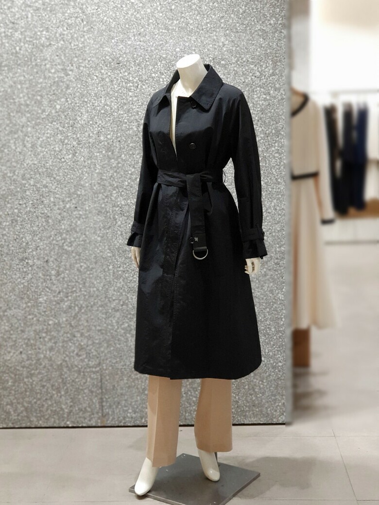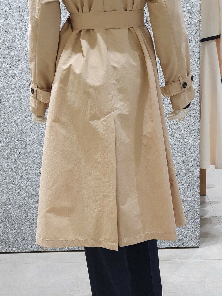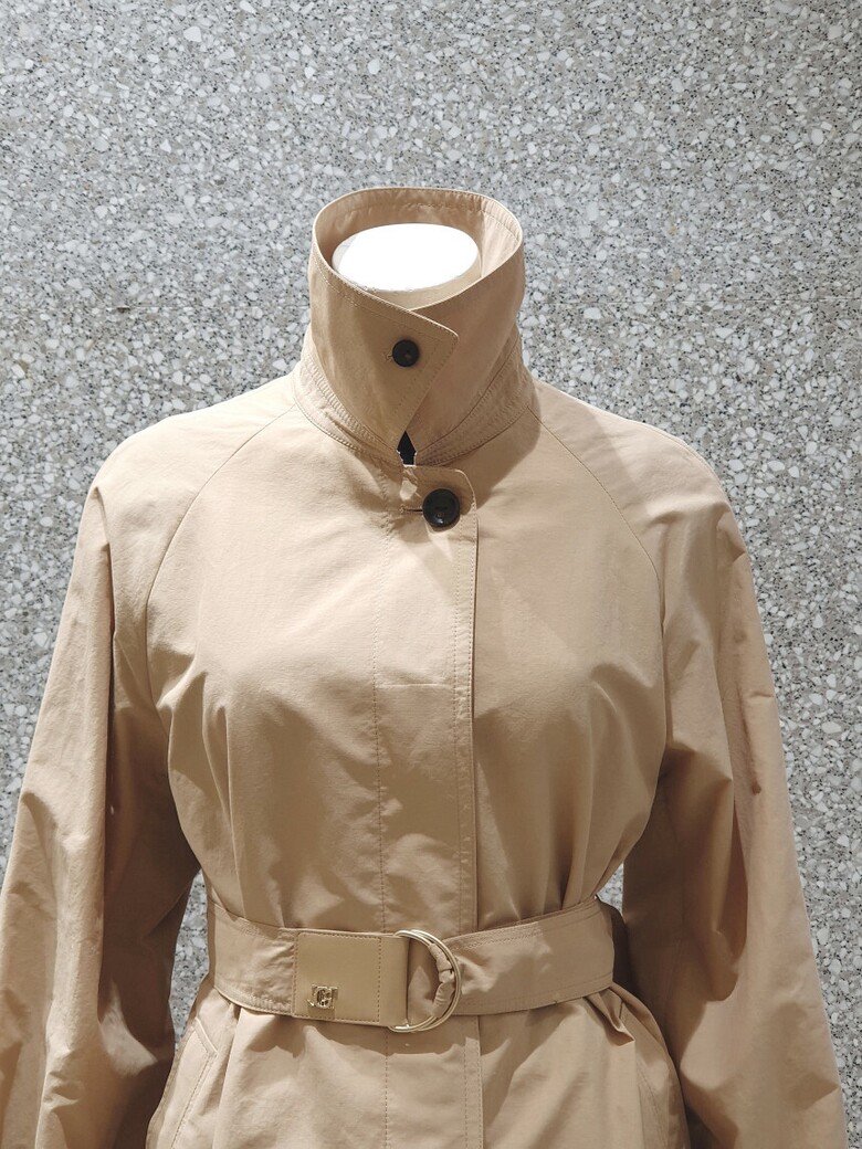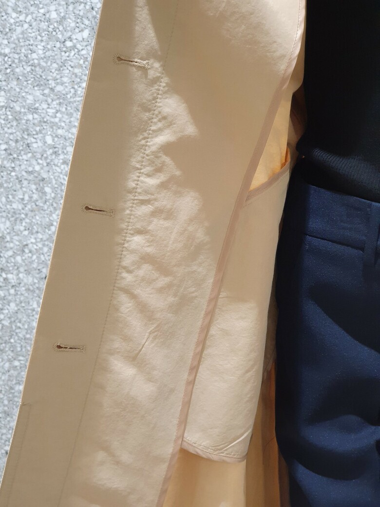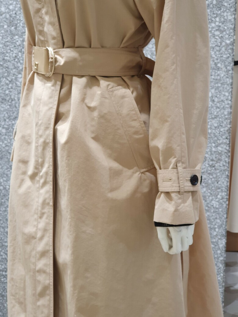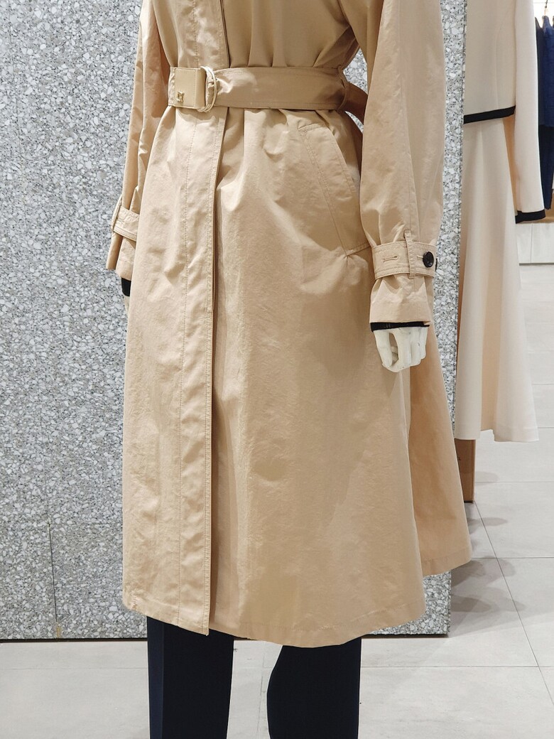 래글런 슬리브 디자인의 트렌치 코트입니다.