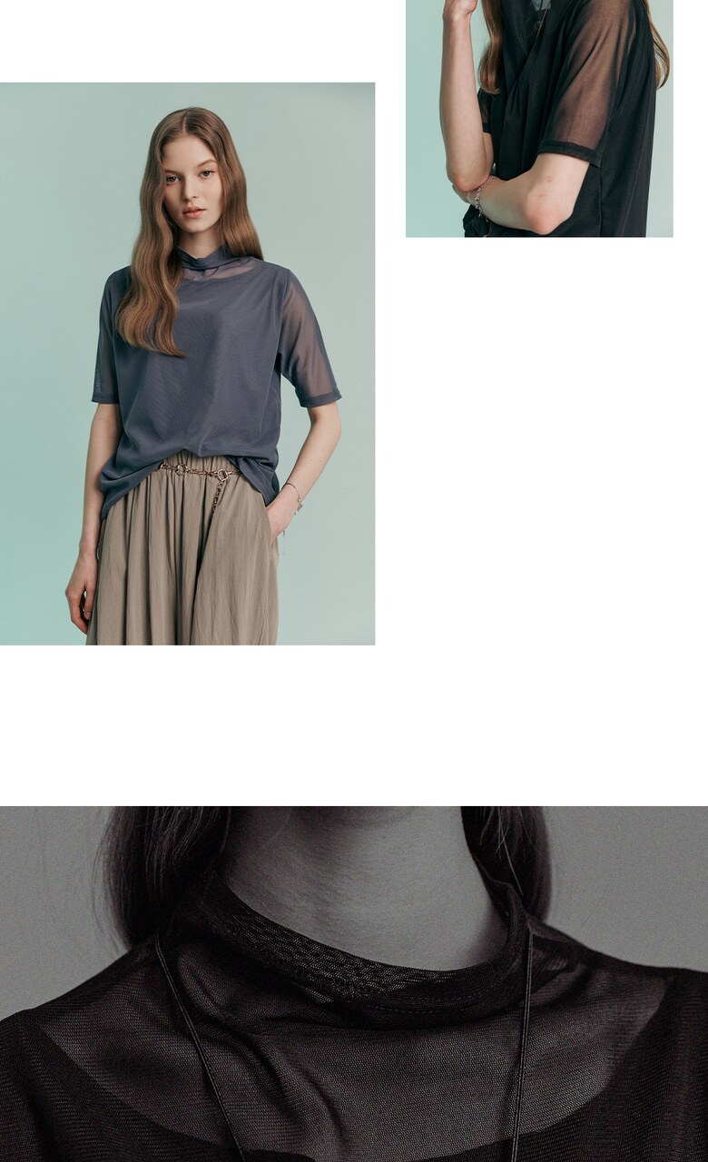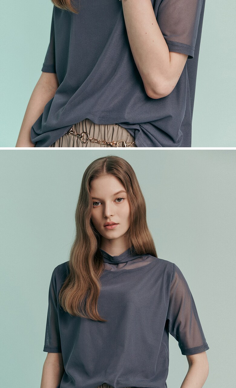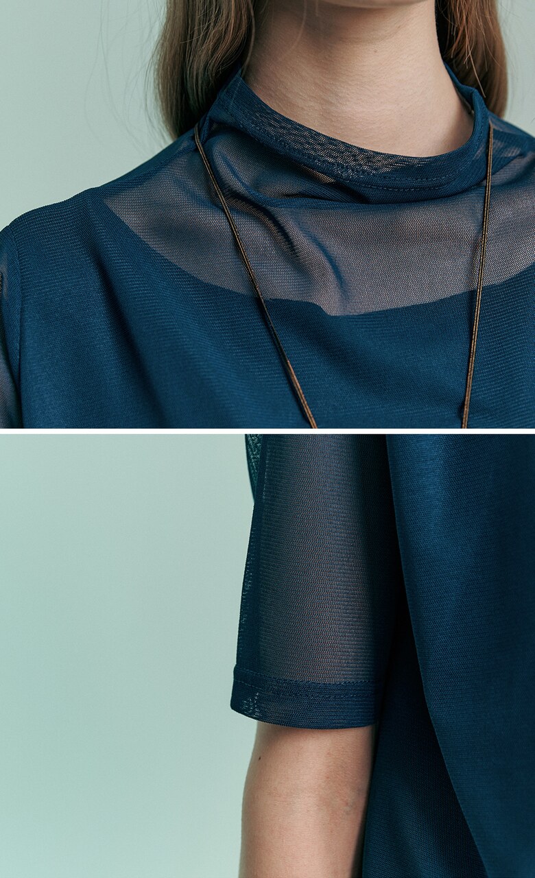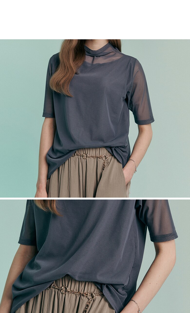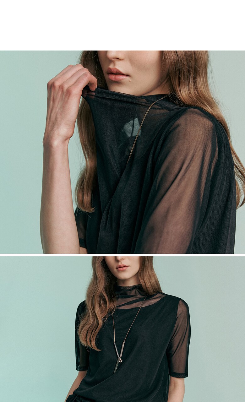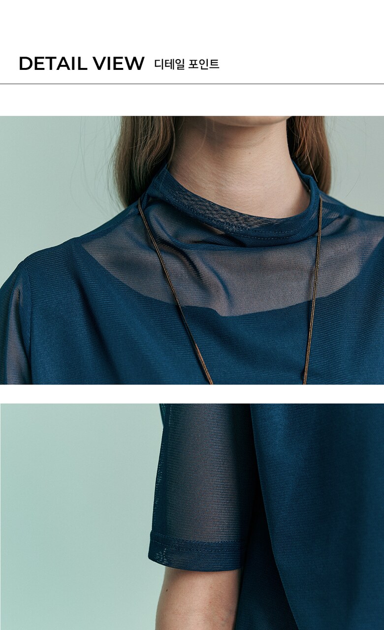 반하이넥 시스루 레이어드 반팔 티셔츠