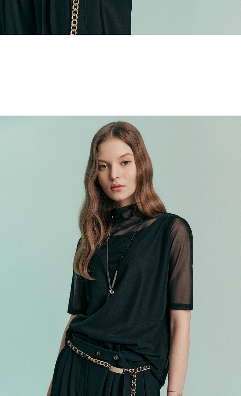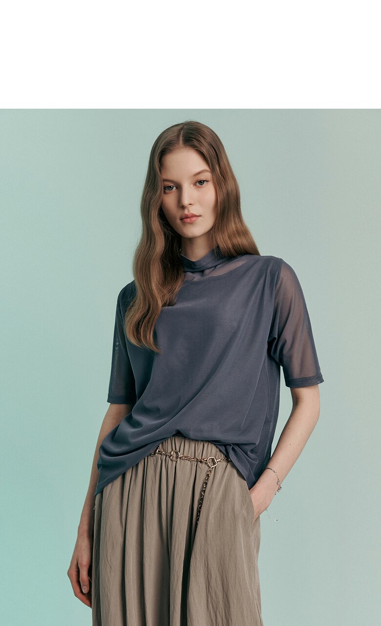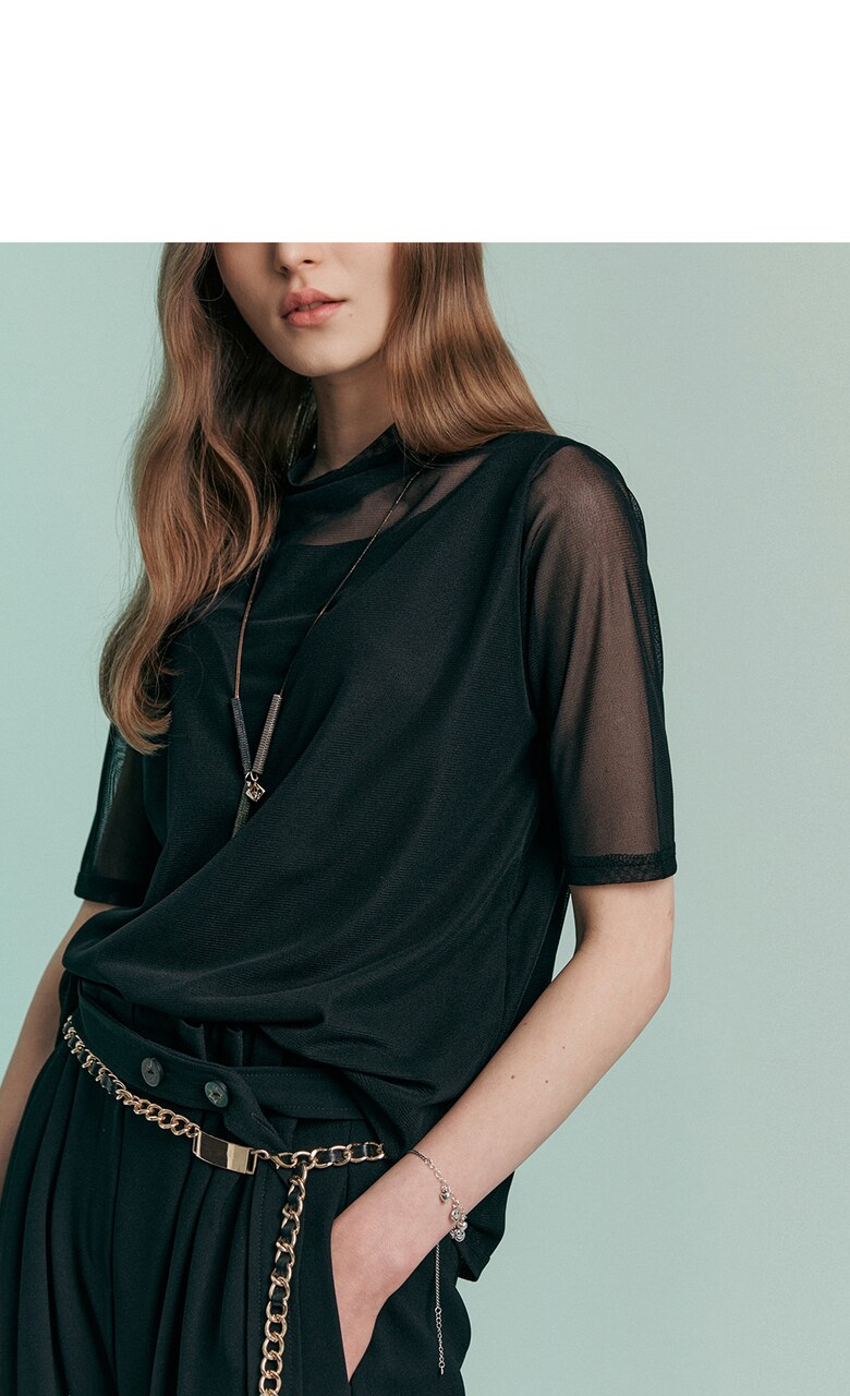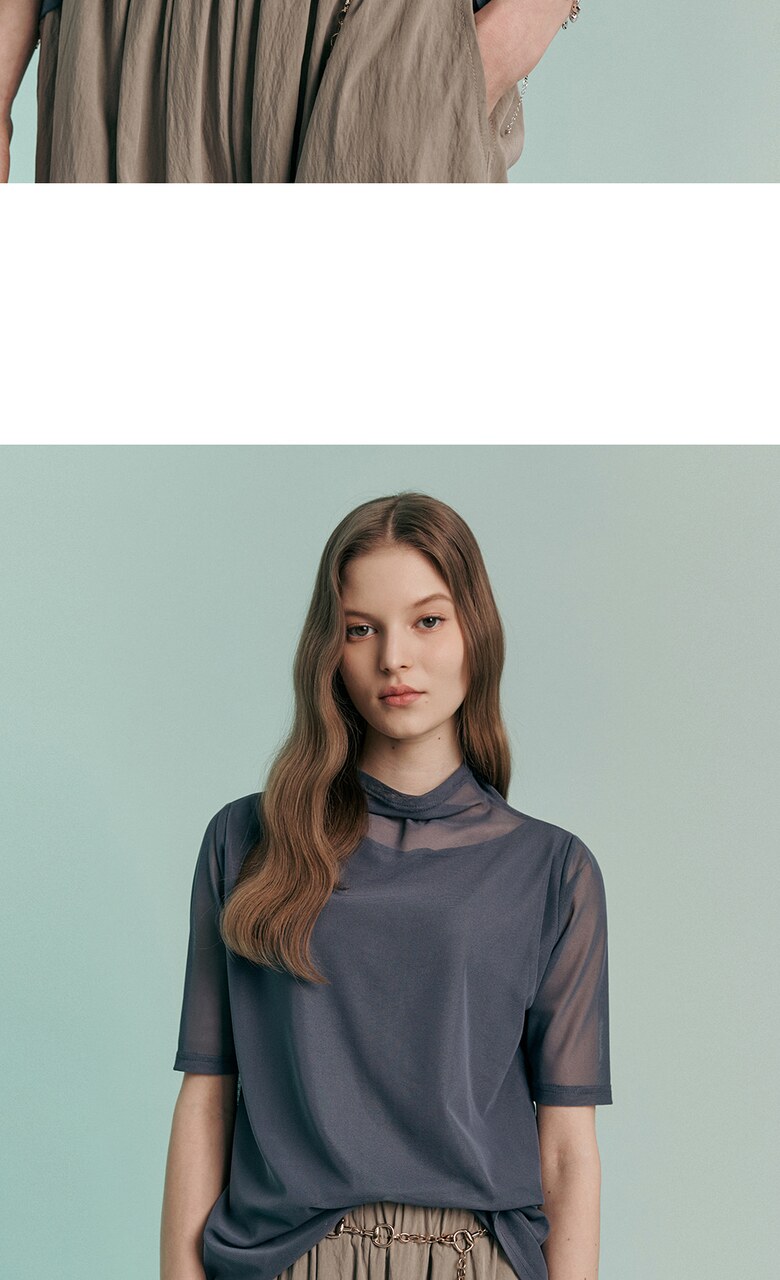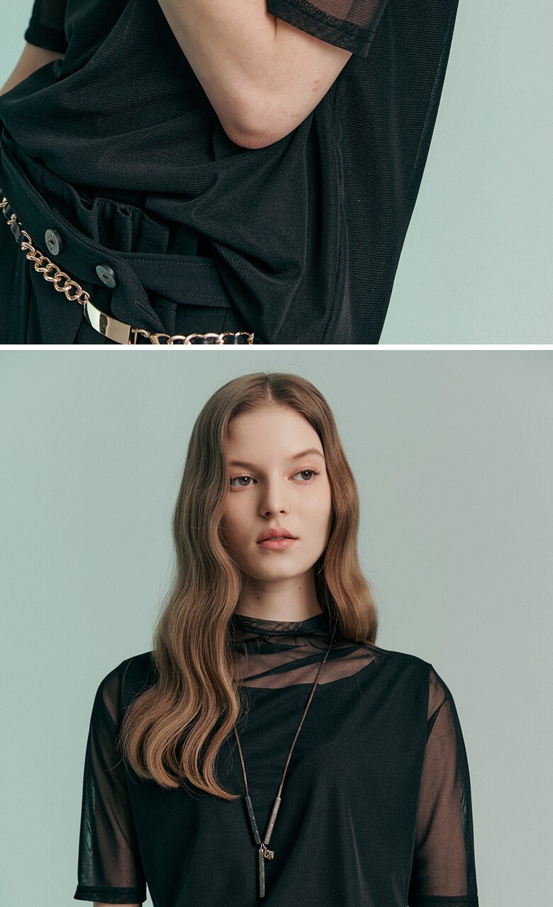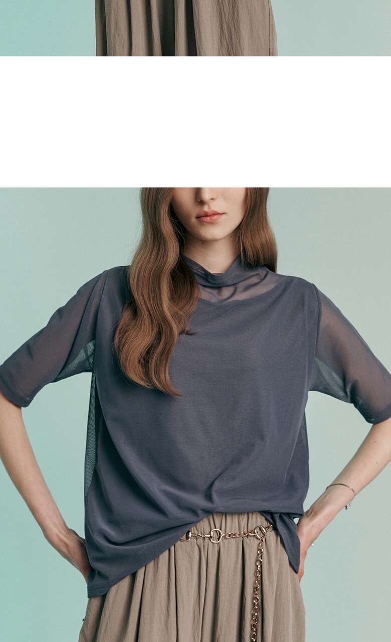 반하이넥 시스루 레이어드 반팔 티셔츠
