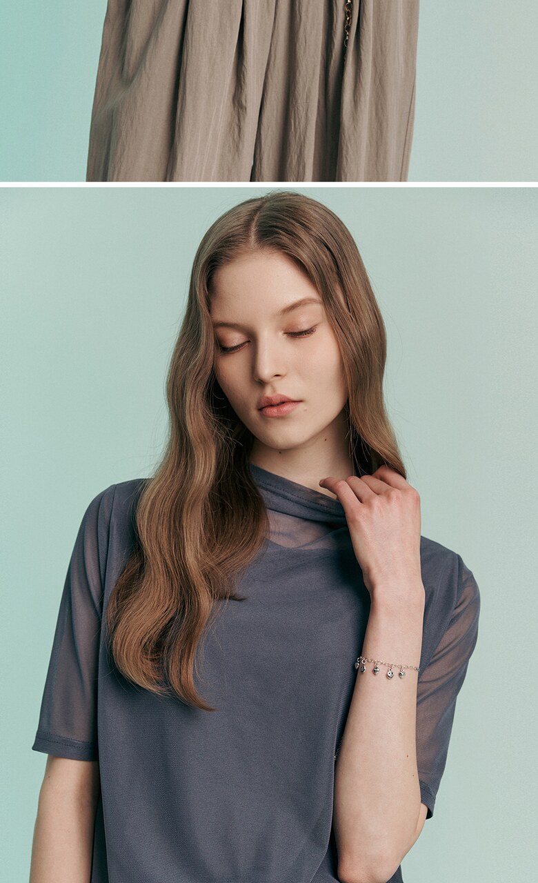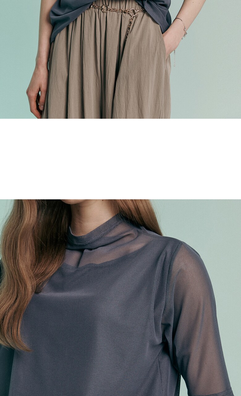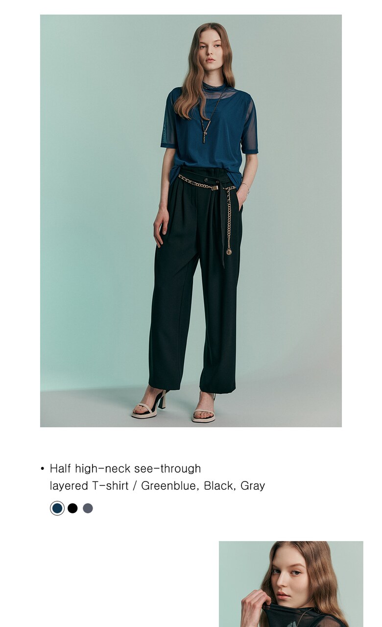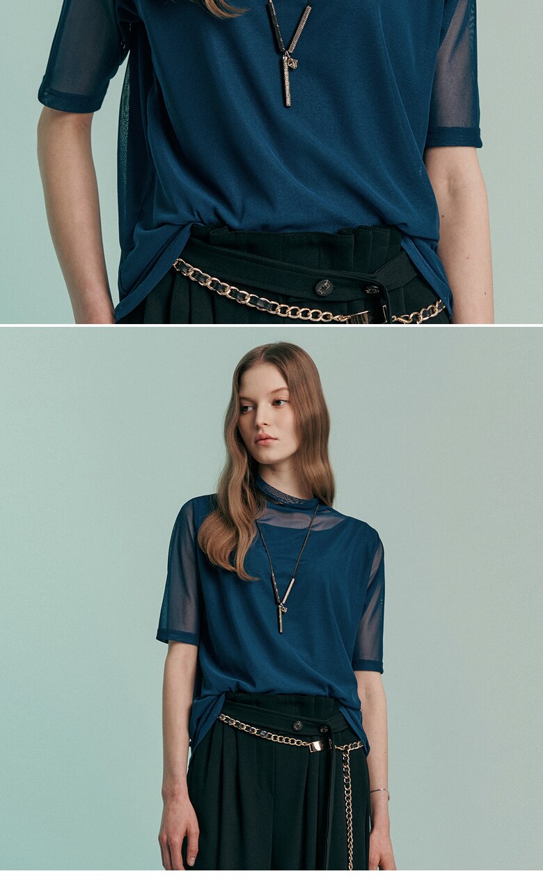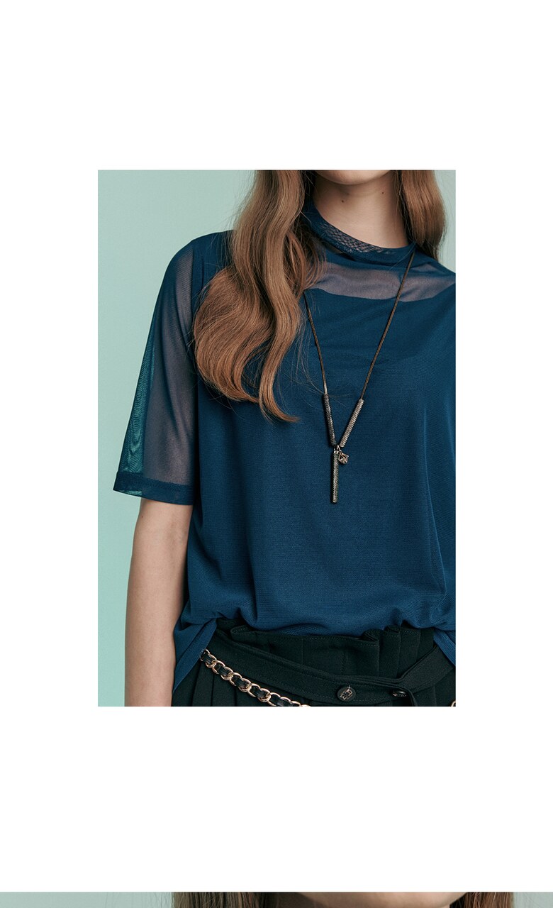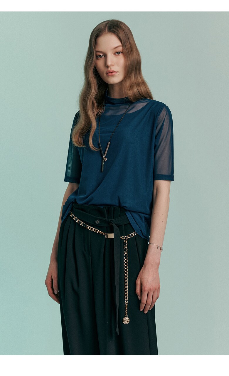 반하이넥 시스루 레이어드 반팔 티셔츠