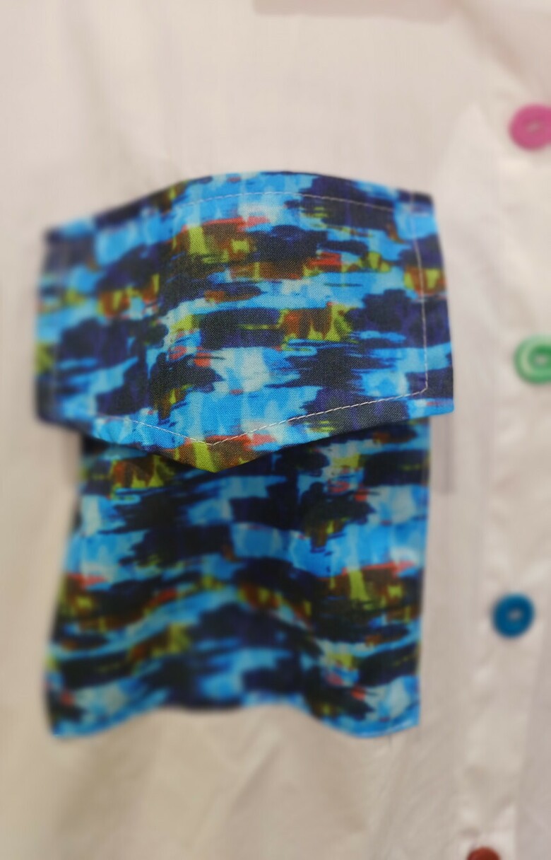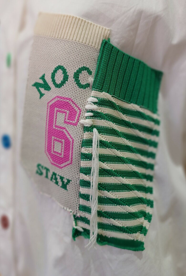주머니 니트 배색으로 컬러감이 돋이는 블라우스 입니다